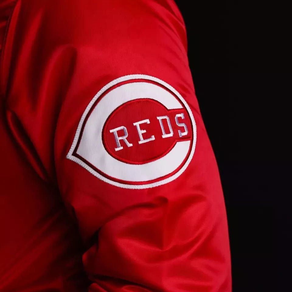 Show off your team spirit in bold style with the Cincinnati Reds Satin Letterman Varsity Jacket. Designed for die-hard fans, this jacket combines vintage varsity flair with a sleek satin finish. The rich Reds colorway stands out, while the embroidered team logos add that authentic MLB edge.