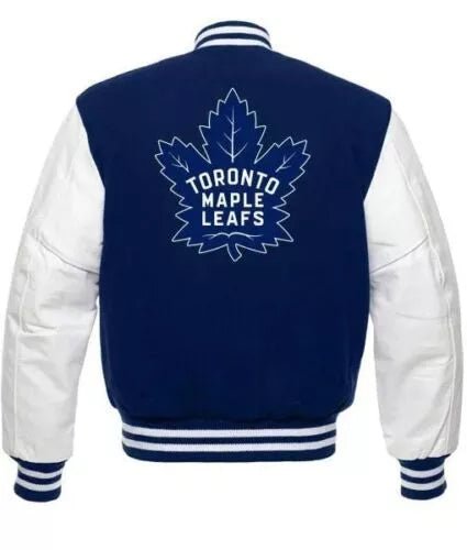 Show off your team pride with the Toronto Maple Leafs Blue and White Letterman Varsity Jacket. This stylish jacket combines the team’s iconic colors with the timeless varsity design, making it a must-have for any Maple Leafs fan. Made with a premium wool body and genuine leather sleeves, it offers both comfort and durability, perfect for any season.