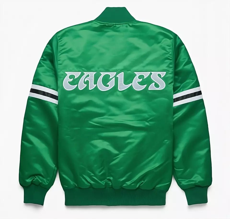 Relive the glory of the ’80s with the Men’s Classic Philadelphia Eagles Green Satin Varsity Jacket. Featuring a bold green satin finish, this jacket exudes retro charm and modern style. The satin fabric gives it a sleek look while providing durability and comfort. The embroidered Philadelphia Eagles logos on the chest and back highlight your unwavering team pride. Whether you’re at the game or out for a casual outing, this jacket offers a timeless look that pays tribute to the Eagles’ legacy.