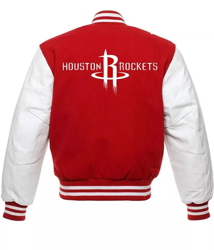 Show off your Houston Rockets pride in style with the Men Letterman Houston Rockets Varsity Jacket. Crafted with a rich red wool body and white genuine leather sleeves, this jacket combines premium materials with the bold energy of the Rockets. Featuring a classic varsity design, it’s perfect for fans who want to bring both comfort and flair to their game-day look.