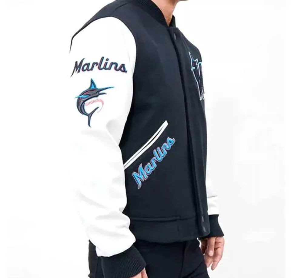 The Men’s Letterman Miami Marlins Navy Blue and White Varsity Jacket combines sporty style with bold team spirit. Featuring a navy blue wool body and white leather sleeves, this jacket offers a sleek, modern look while providing warmth and durability. The embroidered Miami Marlins logo on the chest adds an authentic touch, making it a must-have for any Marlins fan who wants to showcase their loyalty in style. Whether you’re at the ballpark or out for a casual outing, this varsity jacket keeps you cozy and fashionable.