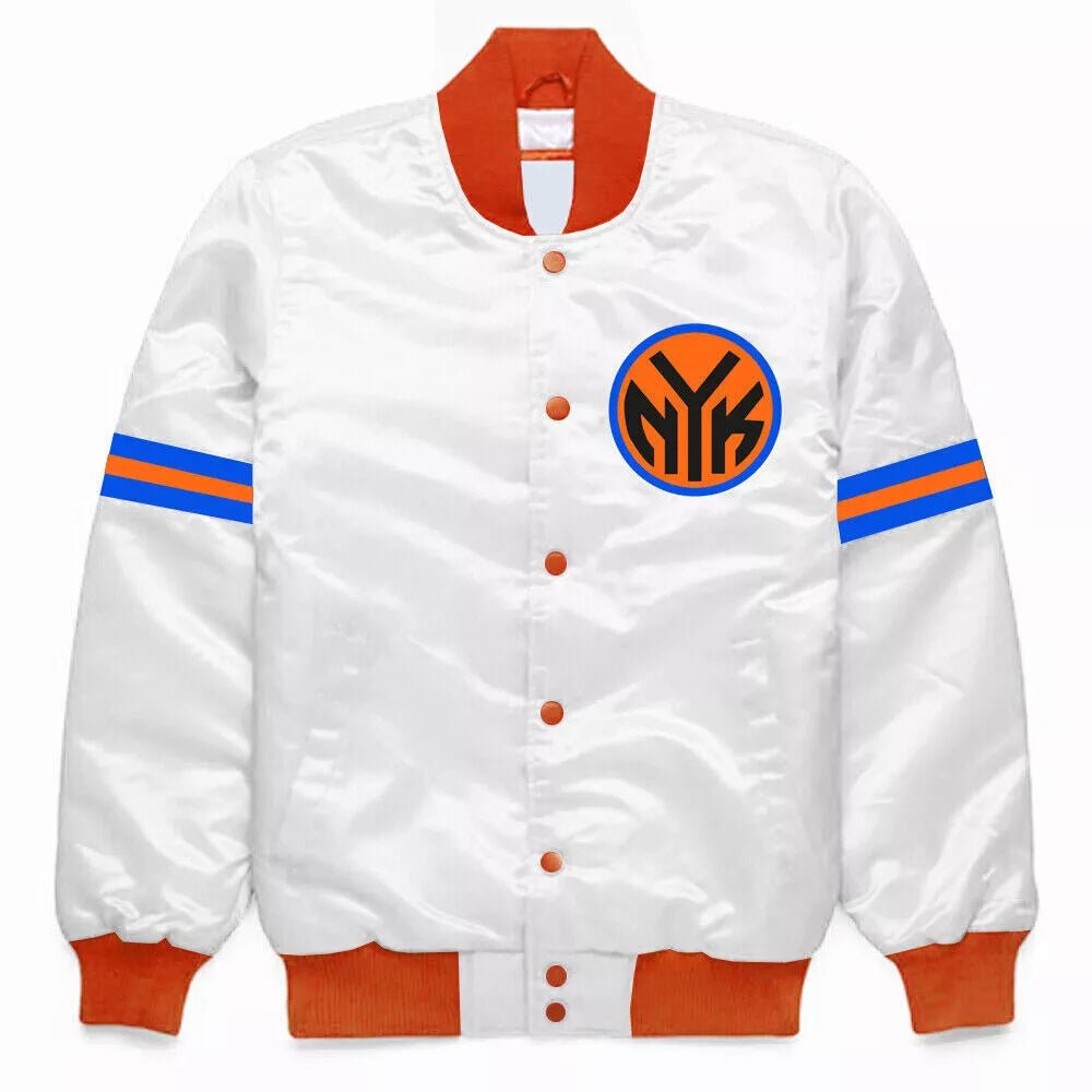 Step up your fan game with the NBA New York Knicks White Satin College Bomber Varsity Jacket. Crafted with premium satin for a sleek and smooth finish, this varsity jacket provides both comfort and style.