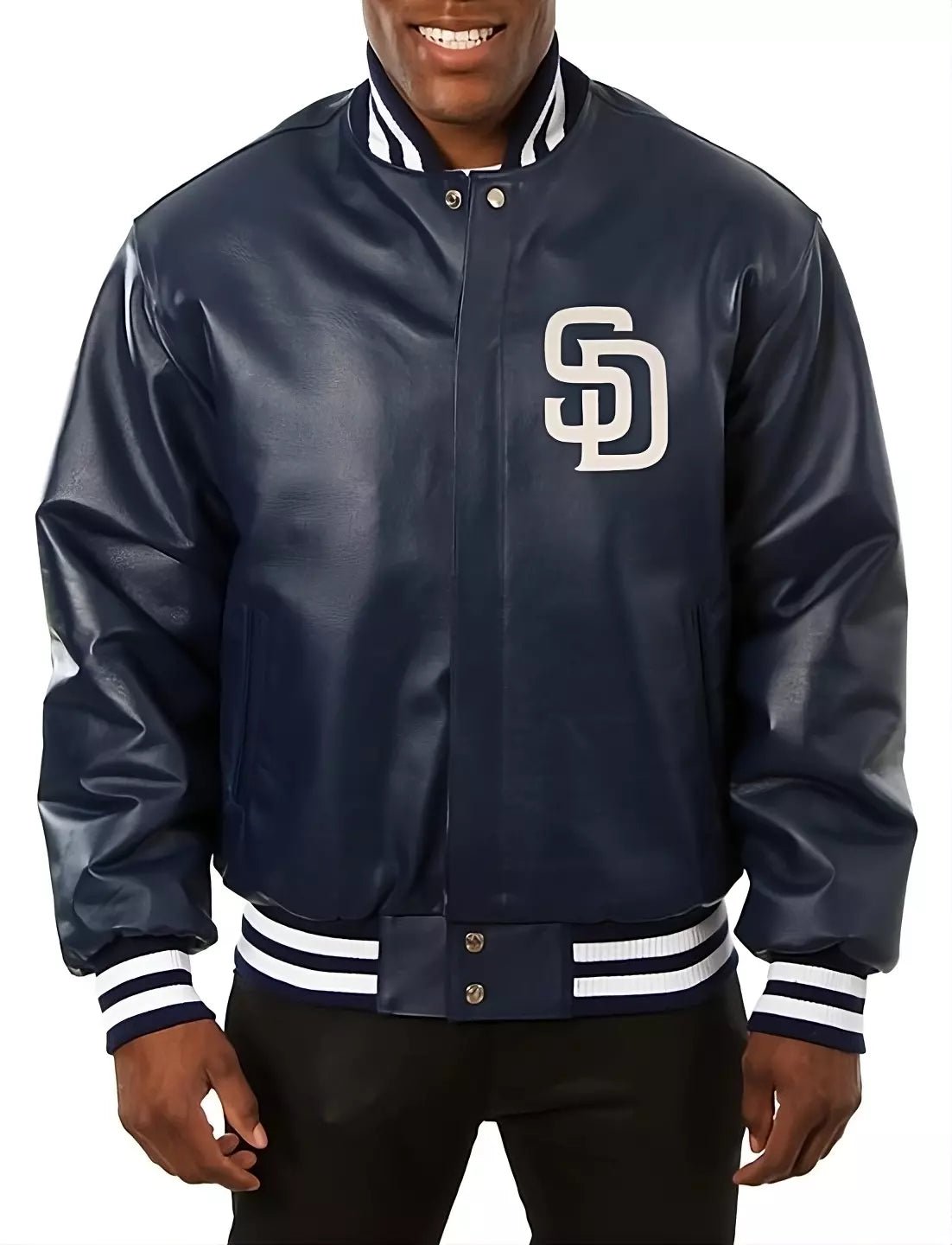 Show your support for the San Diego Padres with the Men’s Navy Letterman Varsity Jacket made from genuine sheep leather. This jacket combines a sleek navy wool body with durable leather sleeves, giving it a premium look that is both stylish and functional. The San Diego Padres logo on the chest adds a touch of authenticity, making it a standout piece for any fan.