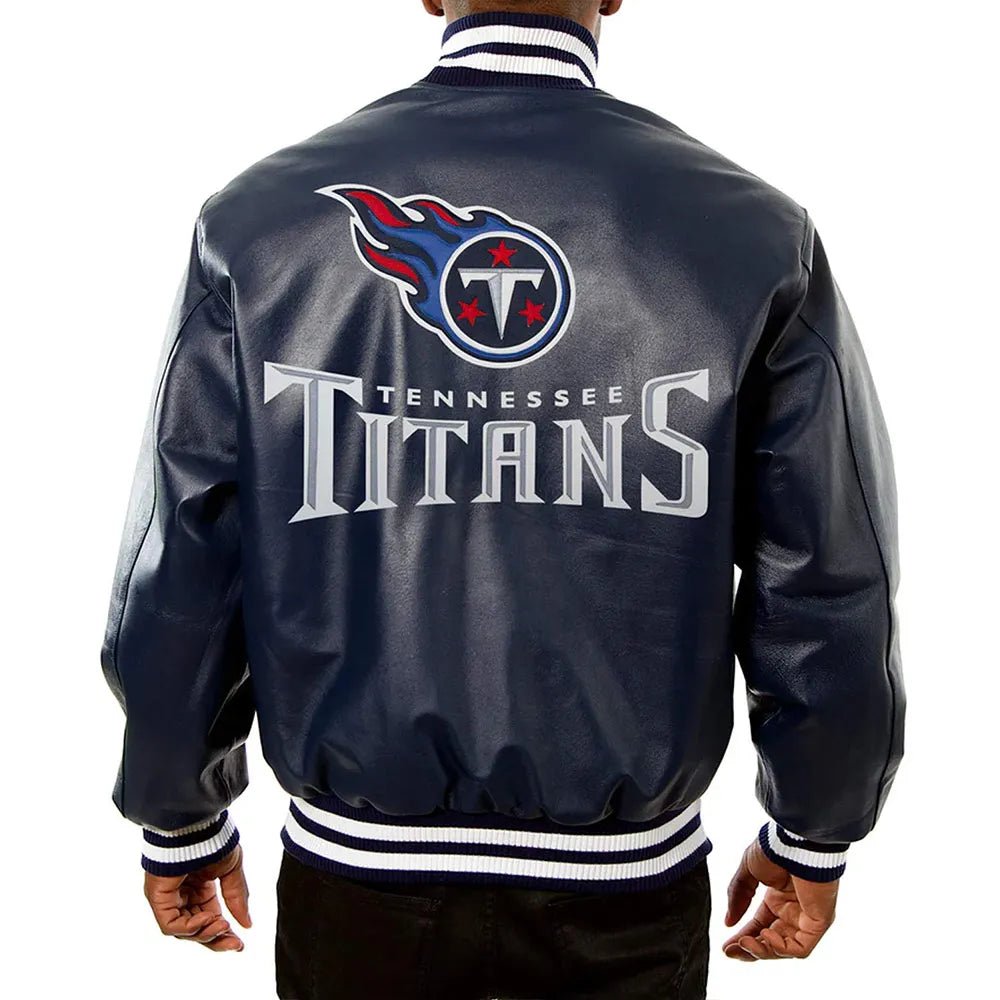 Elevate your game-day look with this Tennessee Titans Navy Blue Varsity Leather Jacket. Featuring premium leather sleeves and a high-quality wool body, this jacket offers a stylish combination of durability and comfort. With its bold team logo and classic varsity style, it’s a must-have for any true Titans fan looking to stand out.