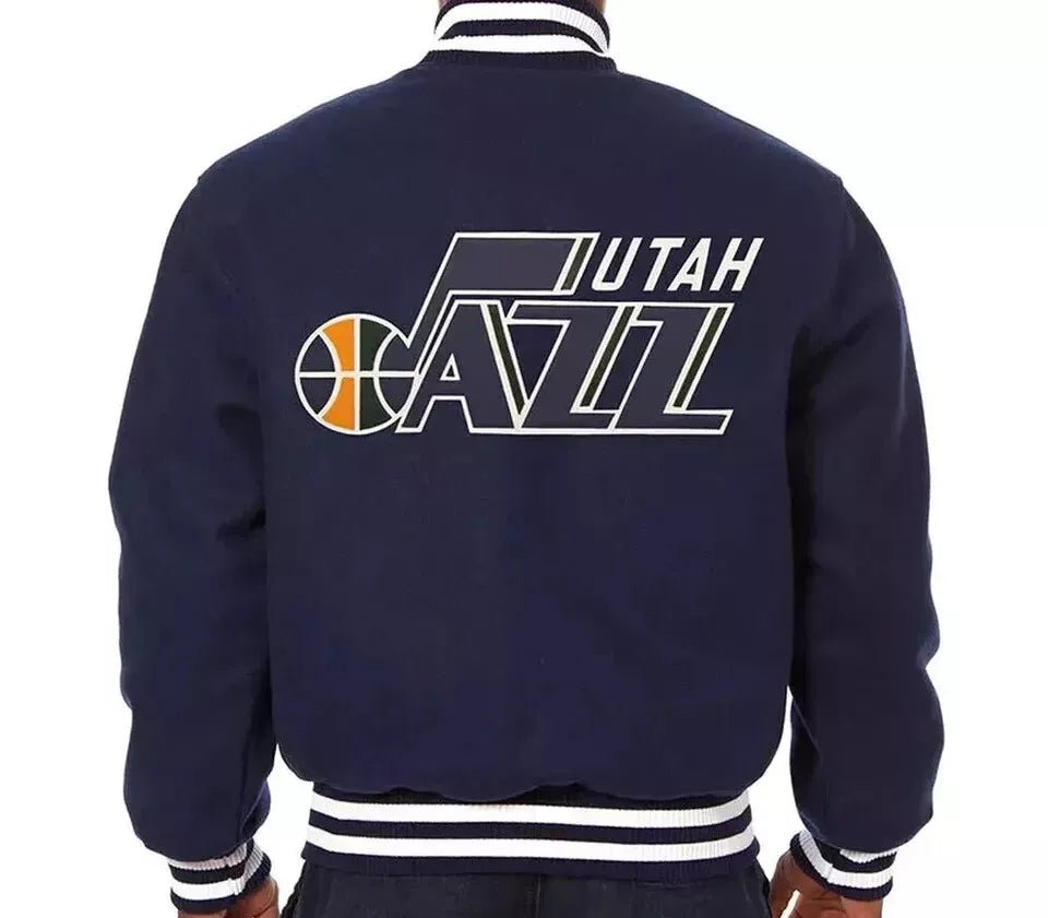 Men Utah Jazz Navy Blue All Wool Letterman Varsity Jacket with Embroidered Logos – NBA