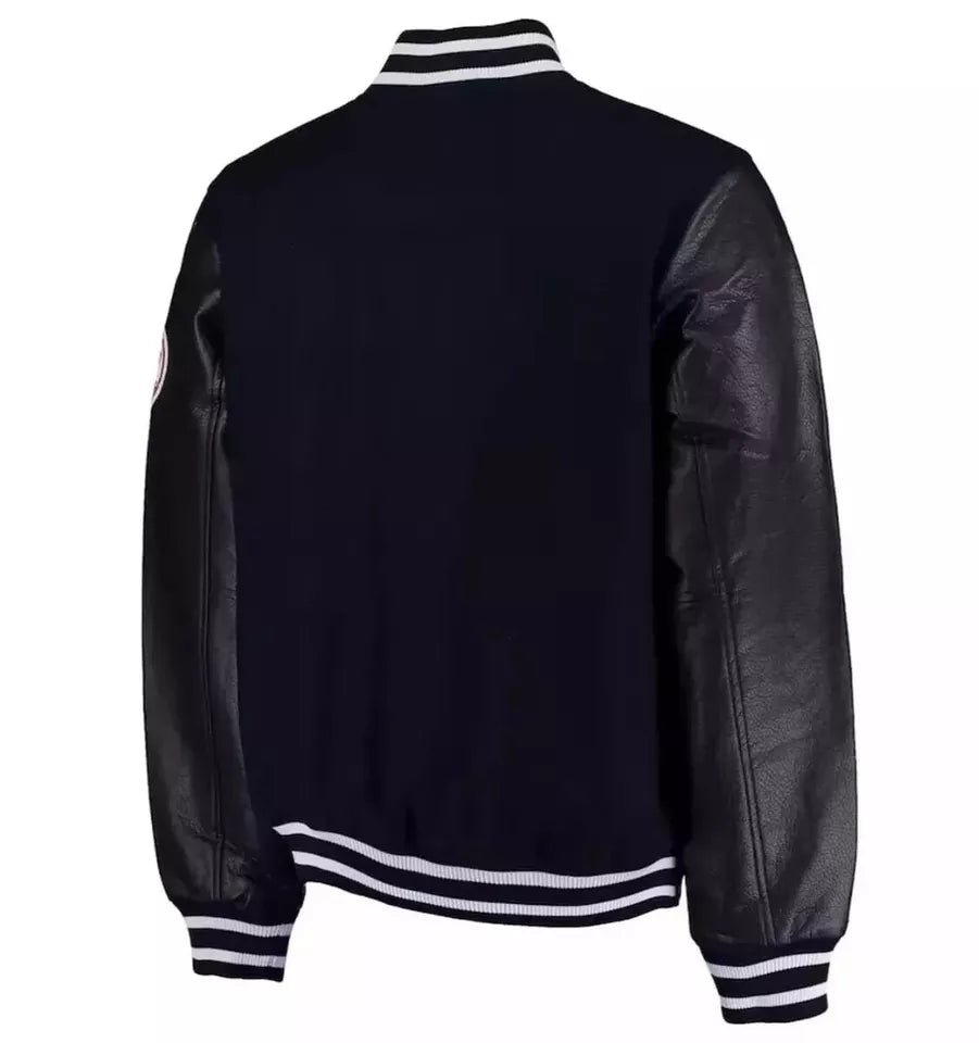 Elevate your Yankees fan gear with this sophisticated New York Yankees letterman varsity jacket. Crafted with a rich navy wool body and sleek black genuine leather sleeves, this jacket exudes timeless style and team pride. The iconic Yankees logo is finely embroidered for an authentic touch, while ribbed detailing on the collar, cuffs, and waistband ensures a snug fit. Whether you’re at the stadium or out on the streets, this premium jacket is a must-have for any dedicated Yankees supporter.”