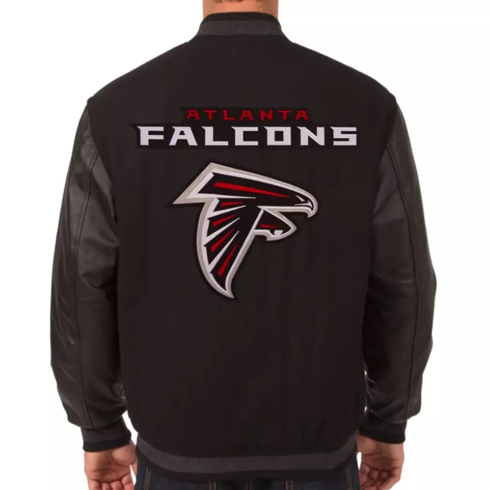 Rep the Falcons in style with this NFL Atlanta Falcons letterman varsity jacket. Featuring a classic wool body paired with durable genuine leather sleeves, this jacket combines team pride with premium quality. The embroidered Falcons logo adds authenticity, while the ribbed collar, cuffs, and waistband provide a snug, tailored fit. Ideal for game days or casual wear, this jacket offers comfort, warmth, and bold team spirit.”